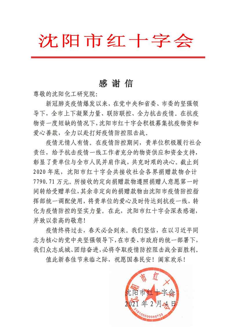 2月4日,沈陽(yáng)市紅十字會(huì)致信沈陽(yáng)院,感謝沈陽(yáng)院在2020年沈陽(yáng)市打贏疫情防控阻擊戰(zhàn)中做出的積極貢獻(xiàn)。感謝信中說(shuō),沈陽(yáng)院積極履行社會(huì)責(zé)任,給予抗擊疫情一線工作者充分的物資供應(yīng)和資金支持,彰顯了沈陽(yáng)院與全市人民并肩作戰(zhàn),共克時(shí)艱的決心。