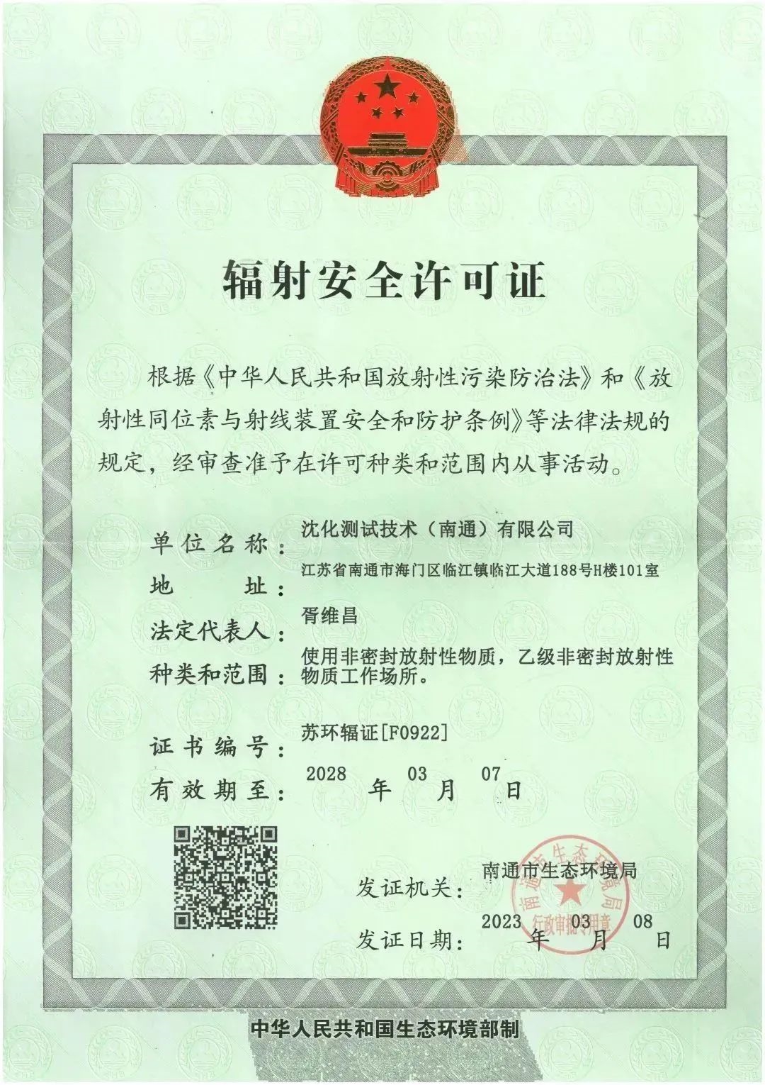 近日,沈陽(yáng)院沈化測(cè)試技術(shù)(南通)有限公司獲得江蘇省南通市生態(tài)環(huán)境局許可的《輻射安全許可證》。至此,測(cè)評(píng)南通公司正式具備了利用放射性核素開展核素標(biāo)記合成實(shí)驗(yàn)和藥物代謝示蹤實(shí)驗(yàn)的法定條件。