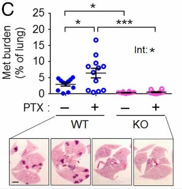 同樣,這些結(jié)果也只出現(xiàn)在野生型小鼠上。這說(shuō)明,紫杉醇的使用改變了肺組織的微環(huán)境,使癌細(xì)胞更容易在肺組織上定殖,這些影響也是通過(guò)Atf3基因?qū)崿F(xiàn)的。