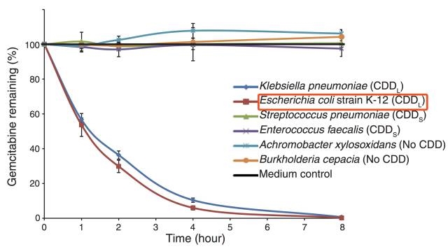 經(jīng)過進(jìn)一步的分析,研究人員發(fā)現(xiàn),具有長鏈CDD的細(xì)菌才具備讓吉西他濱代謝失活的功能。于是他們用大腸桿菌進(jìn)一步驗(yàn)證他們的發(fā)現(xiàn)。