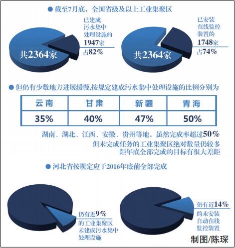 截至7月底,全國(guó)省級(jí)及以上工業(yè)集聚區(qū)共2364家,已建成污水集中處理設(shè)施的1947家,占82%;已安裝在線(xiàn)監(jiān)控裝置的共1748家,占74%。但仍有少數(shù)地方進(jìn)展緩慢,云南、甘肅、新疆、青海等地按規(guī)定建成污水集中處理設(shè)施的比例分別為35%、40%、47%、50%;湖南、湖北、江西、安徽、貴州等地,雖然完成率超過(guò)50%,但未完成任務(wù)的工業(yè)集聚區(qū)絕對(duì)數(shù)量仍較多,距年底全部完成的目標(biāo)有很大差距;河北省按規(guī)定應(yīng)于2016年底前全部完成,但仍有近9%的工業(yè)集聚區(qū)未建成污水集中處理設(shè)施,近14%的未安裝自動(dòng)在線(xiàn)監(jiān)控裝置。