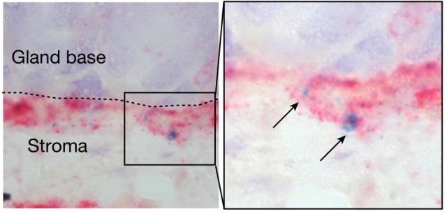 為了確定幽門螺桿菌具體是如何促進胃粘膜干細(xì)胞增殖的。Meyer博士采用單分子原位雜交技術(shù)對小鼠胃粘膜干細(xì)胞進行系統(tǒng)分析。結(jié)果發(fā)現(xiàn),小鼠的胃粘膜下,位于胃腺基底的干細(xì)胞池中存在兩種不同類型的干細(xì)胞。一種干細(xì)胞分化程度低,增殖能力強,另一種分化程度較高,增殖能力較弱。