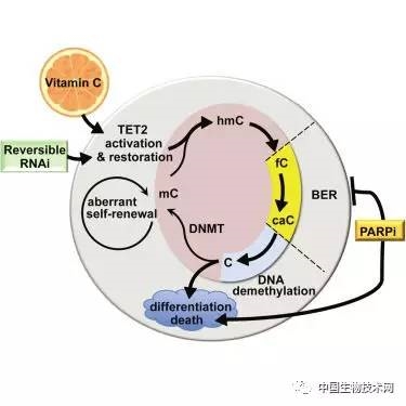 研究人員發(fā)現(xiàn),將維生素C和PARP抑制劑結(jié)合可以增強(qiáng)對(duì)白血病干細(xì)胞的作用,使它們從自我更新轉(zhuǎn)向成熟和細(xì)胞死亡。研究結(jié)果還表明,維生素C也可以驅(qū)使沒有TET2突變的白血病干細(xì)胞走向死亡,因?yàn)樗芴嵘魏握5腡ET2活性。